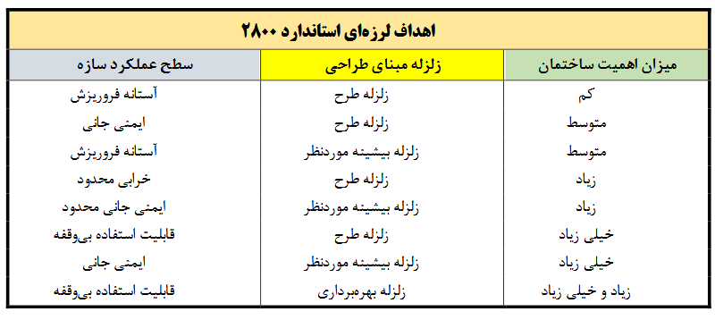 جدول ۱- اهداف لرزه‌ای استاندارد ۲۸۰۰
